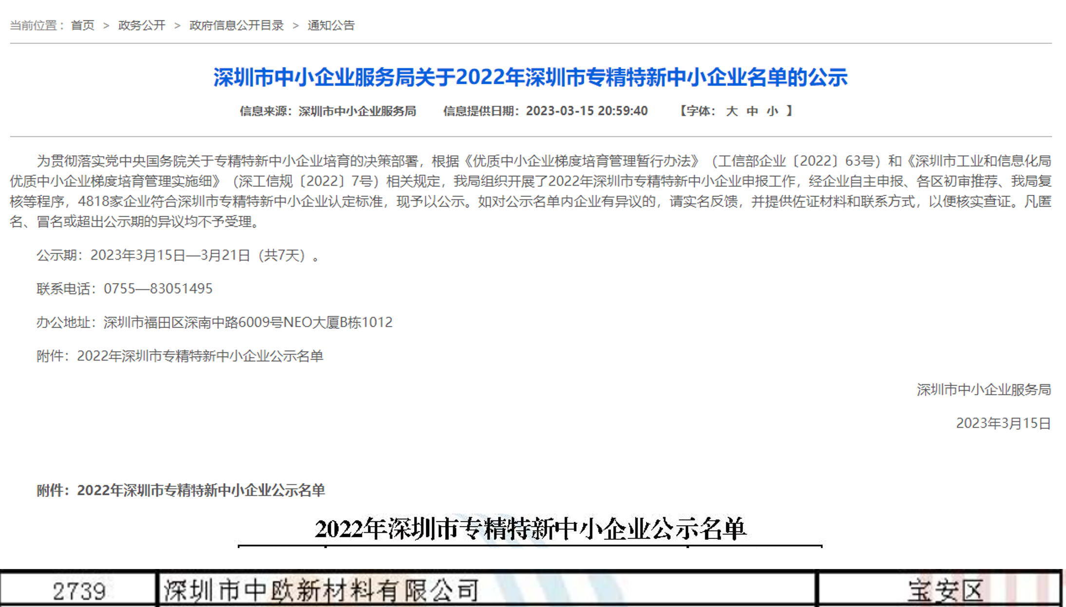 一份耕耘,一份收獲,經(jīng)過公司全體員工的共同努力,深圳市中歐新材料有限公司于2023年3月榮膺深圳市“專精特新”企業(yè)!