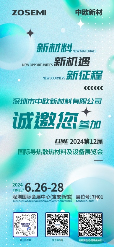 2024年6月26日,第12屆深圳國(guó)際導(dǎo)熱散熱材料及設(shè)備展覽會(huì)于深圳國(guó)際會(huì)展中心(寶安新館)7號(hào)館開展,中歐新材攜全體銷售團(tuán)隊(duì),在7H01展位等待各位的蒞臨。